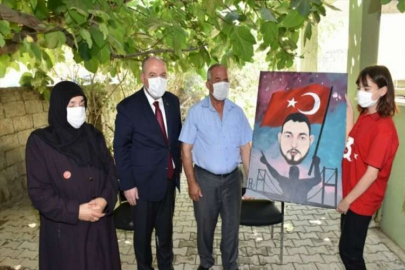 Vali Coşkun, aileye, Aile, Çalışma ve Sosyal Hizmetler İl Müdürlüğüne bağlı çocuk evlerinde misafir olan çocukların yaptığı, şehidin yağlı boya tablosu ile filografi tekniğiyle hazırlanan Türk bayrağını hediye etti.