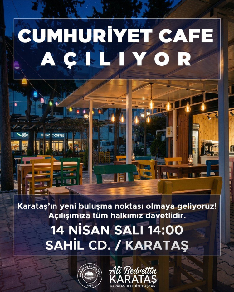 Karataş Belediyesi’nin önümüzdeki süreçte de yeni projelerle ilçeye değer katmaya devam edeceği belirtilirken, Cumhuriyet Cafe’nin açılışı 14 Nisan Salı günü saat 14.00’te gerçekleştirilecek. Başkan Karataş, tüm vatandaşları açılışa katılmaya davet etti.