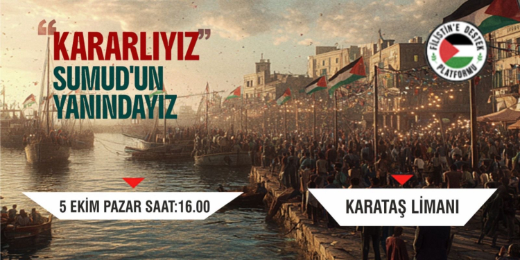 Adana’da Filistin’e destek için geniş katılımlı bir etkinlik düzenleniyor. Filistin Dayanışma Platformu tarafından organize edilen program, 5 Ekim Pazar günü saat 16.00’da Karataş Limanı’nda yapılacak. “Mazlumlara umut SUMUD için sesimizi yükseltiyoruz” sloganıyla duyurulan etkinlikte binlerce araçla Karataş’a gidilecek, yüzlerce tekneyle Akdeniz’e açılınacak.