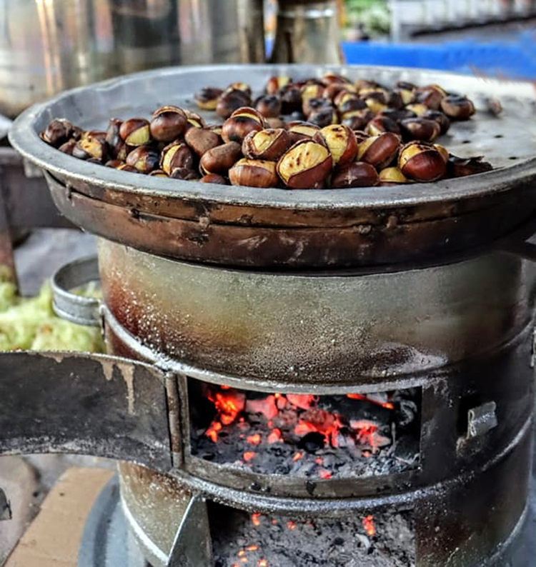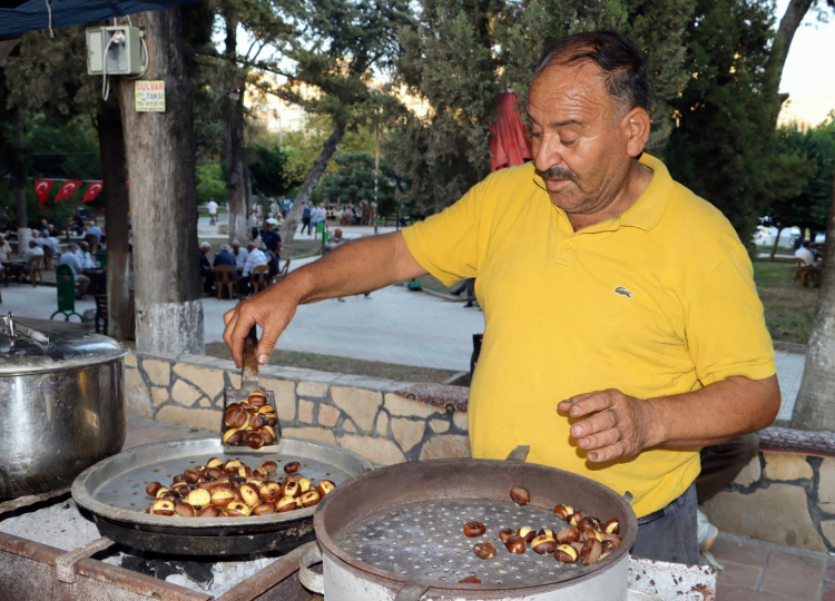 Kış akşamlarının vazgeçilmez lezzeti olan kömür ateşinde pişirilen kestaneler, yükselen sıcak kokusuyla tezgâhların önünde hareketlilik oluştururken, mevsimin gelişini hissettiren geleneksel tat olarak öne çıkıyor.