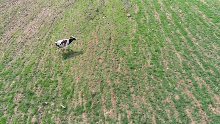 Gökçeören Mahallesindeki arazisine giren ineği gören vatandaş, evden çıkmak yerine farklı bir çözüm buldu. Vatandaş, drone ineğin olduğu yere doğru uçurarak hayvanın dikkatini çekti. Dronu gören inek, korkarak hemen araziden kaçtı. O anlar dronun kamerasına yansıdı.