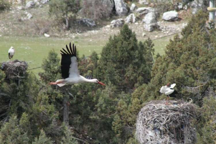 Konya'nın Beyşehir ilçesinde ilkbahar mevsiminin gelmesi ile birlikte ardıç ağaçlarının üzerindeki yuvalar yeniden leyleklerle şenlendi.