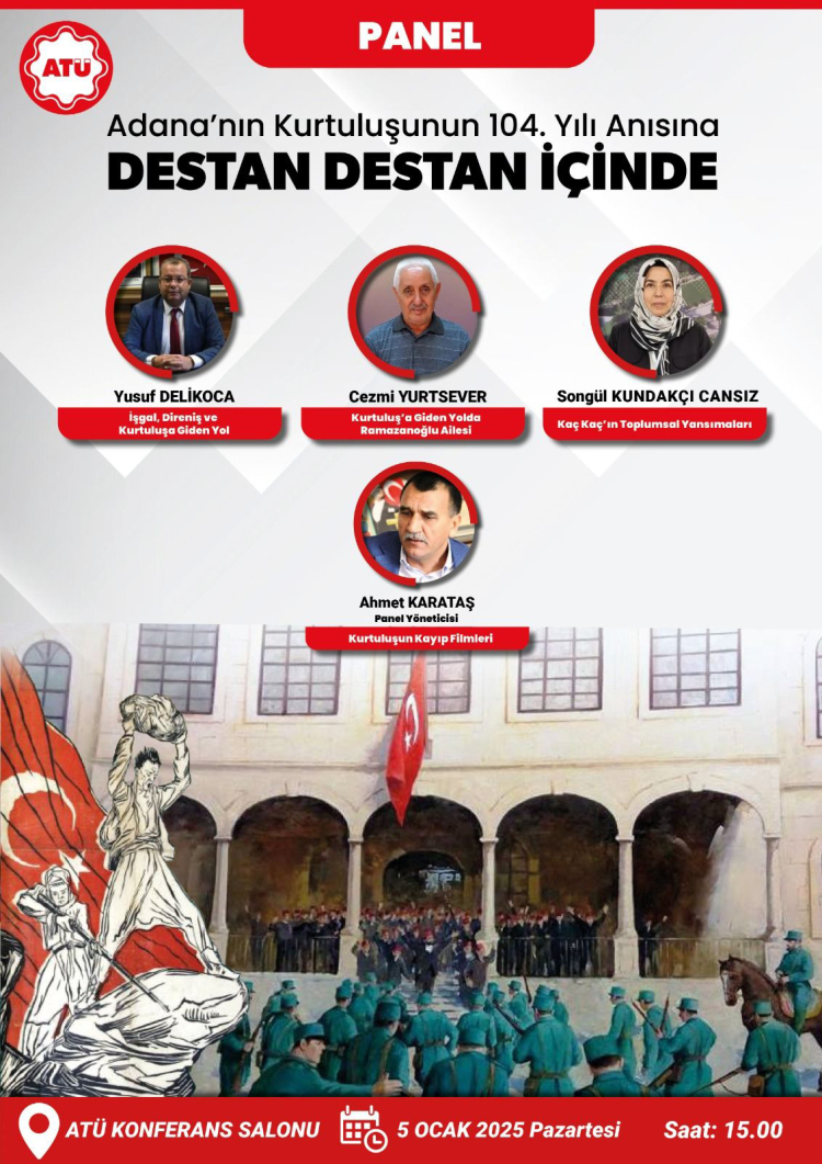 Adana’nın düşman işgalinden kurtuluşunun 104. yıl dönümü kapsamında, Adana Alparslan Türkeş Bilim ve Teknoloji Üniversitesi tarafından düzenlenecek “Destan Destan İçinde” adlı panelde, kentin direniş hafızası, yerel tarihçiler ve akademik belgeler ışığında ele alınacak.
