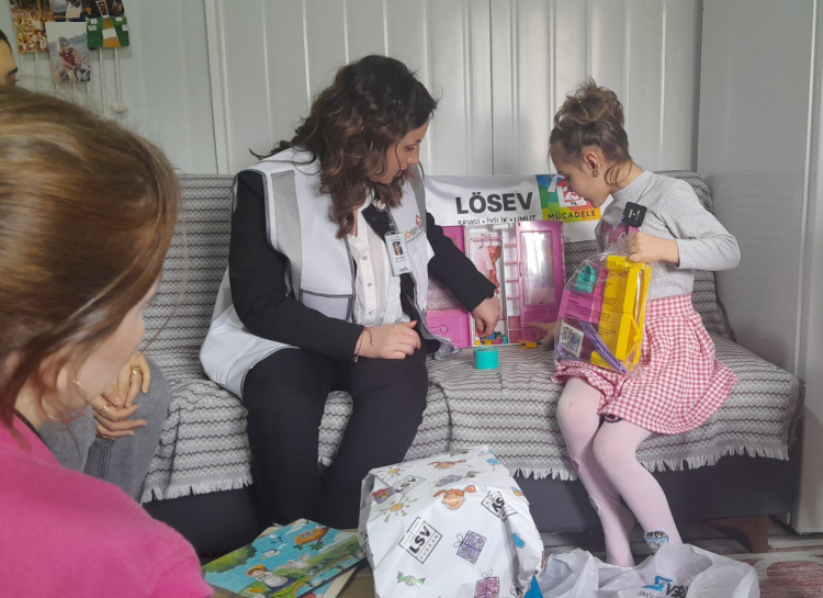 LÖSEV Sosyal Hizmetler Genel Koordinatörü Jülide Arifoğlu, LÖSEV Adana İrtibat Ofisi İl Koordinatörü Betül Özgüven ve LÖSEV Sosyal Hizmet Sorumlusu Deniz Bayraktar Çoban, Hatay’da yaşayan Sökmen ve Ördek ailelerini ziyaret etti. Ziyaretlerin ilk durağı, deprem sonrası Lösemi teşhisi konan 3 yaşındaki Kumsal Ördek’in ailesi oldu. Konteyner kentte yaşamını sürdüren aileyi evlerinde ziyaret eden heyet, Kumsal’a hediyeler sunarken, annesi Seren Ördek’e 100 bin TL’lik yardım çekini takdim etti. Ziyaret esnasında LÖSEV yetkilileri, her zaman lösemili çocukların yanında olacaklarını belirtti.
