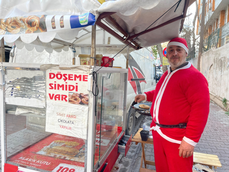 Adana’nın simgesi haline gelen döşeme simidi, hem lezzeti hem de kendine özgü tarifiyle Adanalıların vazgeçilmezi olmaya devam ediyor. 2024 yılının son günlerinde Adana’da döşeme simidi satan Mecit Aral, Noel baba kostümüyle yılbaşını karşılıyor.