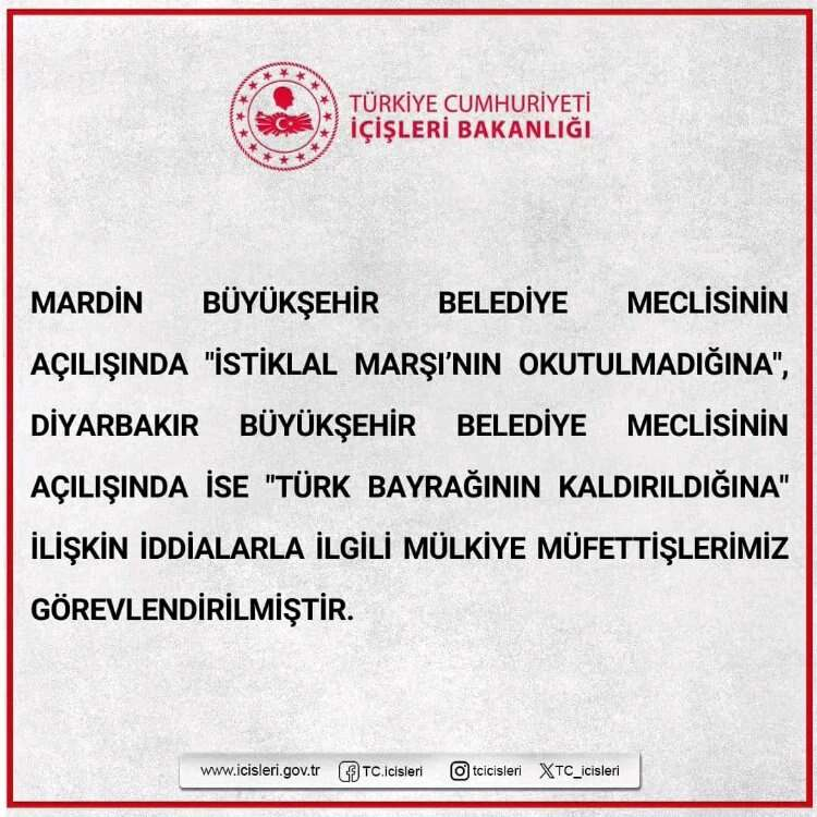 "Mardin Büyükşehir Belediye Meclisinin açılışında 'İstiklal Marşı’nın okutulmadığına', Diyarbakır Büyükşehir Belediye Meclisinin açılışında ise 'Türk bayrağının kaldırıldığına' ilişkin iddialarla ilgili Mülkiye Müfettişlerimiz görevlendirilmiştir."