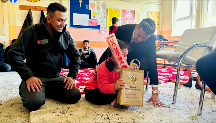 Özel çocuklarla eğlenceli vakit geçirilerek çeşitli hediyeler veren ormancılar, birlikte "Yüksek Tepelere Ev Kurmasınlar" şarkısını da birlikte söyledi.