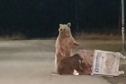 Kars’ın Sarıkamış ilçesinde gece saatlerinde görülen ayılar, çöp konteynerlerinde yiyecek aradı. Ayıların agresif tavırları ise kameraya yansıdı. Sarıkamış’ta kış uykusundan uyanır uyamaz karınlarını doyurmak için yerleşim yerlerine inen 2 boz ayı çöplerin içerisinde hem yiyecek aradı, hem de etrafı gözledi. Bir süre yiyecek arayan ayılar daha sonra bölgeden uzaklaşarak gözlerden kayboldu.