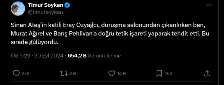 Gazeteci Timur Soykan konu ile alakalı sosyal medya hesabından yaptığı paylaşımda şu ifadelere yer verdi: “Sinan Ateş'in katili Eray Özyağcı, duruşma salonundan çıkarılırken ben, Murat Ağırel ve Barış Pehlivan'a doğru tetik işareti yaparak tehdit etti. Bu sırada gülüyordu.”