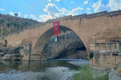 Adıyaman’ın Kahta ilçesinde bir grup genç, Roma dönemine ait bin 800 yıllık tarihi Cendere Köprüsü’ne Filistin bayrağı asarak İsrail’in Gazze’deki katliamına tepki gösterdi.