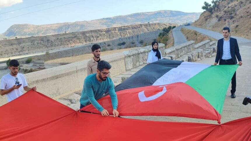 İsrail’in Gazze’ye saldırmasına tüm dünyada tepkiler yağarken Kahtalı bir grup genç ise Filistin’e destek için Türk ve Filistin bayrağını birbirine bağlayarak tarihi Cendere Köprüsü’nde dalgalandırdı.
