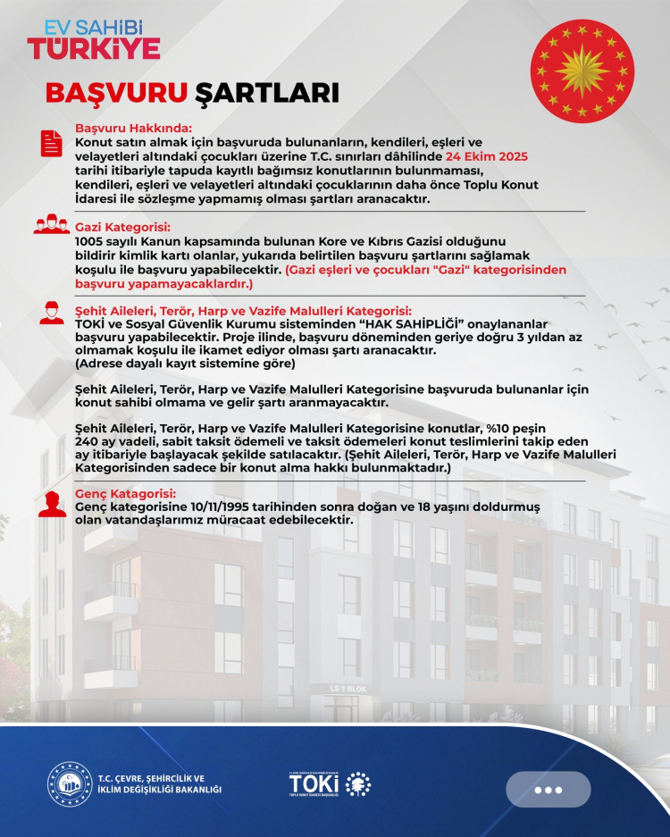 Başvuru sahibinin 18 yaşını doldurmuş olması gerekiyor. Başvuru sahibinin en az 10 yıldır T.C. vatandaşı olması şartı aranıyor. Başvuru sahiplerinin, kendileri, eşleri veya velayet altındaki çocukları adına Türkiye sınırları içinde kayıtlı konutu bulunmaması gerekiyor. Daha önce TOKİ ile konut sözleşmesi imzalamamış olmak şart. Başvuru dönemi sonu itibarıyla evli olan eşlerin her ikisi de bu şartları birlikte taşımak zorunda.