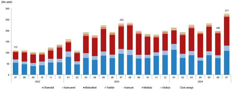 Türkiye İstatistik Kurumu (TÜİK) Temmuz ayı Motorlu Kara Taşıtları verilerini açıkladı. Verilere göre, Temmuz ayında trafiğe kaydı yapılan motorlu kara taşıtlarının sayısı, önceki aya göre %39,3 oranında artış gösterdi. Bu artışla birlikte, trafiğe kayıtlı toplam taşıt sayısı 30 milyon 261 bin 176'ya ulaştı. Temmuz ayında kaydedilen 276 bin 615 adet taşıtın %46,9'unu motosikletler, %39,4'ünü otomobiller oluşturdu.