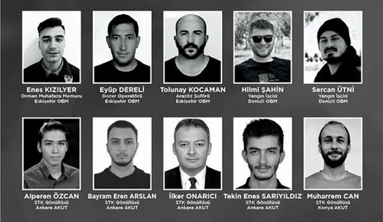 Eskişehir’in Seyitgazi ilçesinde çıkan yangında görev yapan 5 AKUT gönüllüsü ve 5 orman işçisi yaşamını yitirdi. Şehit düşen Alperen Özcan, Tekin Enes Sarıyıldız, İlker Onarıcı, Muharrem Can, Bayram Eren Arslan, Sercan Utmi, Hilmi Şahin, Eyip Dereli, Enes Kızılyer ve Tolunay Kocaman düzenlenen törenle son yolculuklarına uğurlandı.