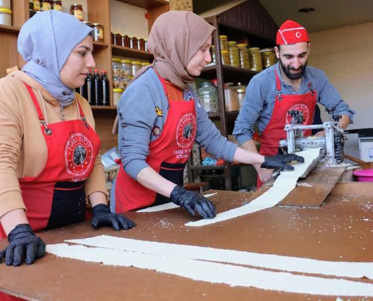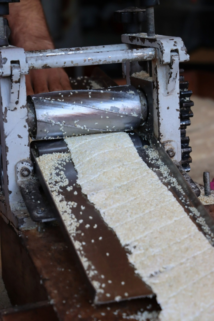 Küncülü Helva'nın üretimi adeta bir ritüel. Tahin, şeker ve su üç saatlik sabırla kaynatılıyor. Ardından kavrulmuş küncüler (susam) ekleniyor ve 64 yıllık özel bir makineyle hamura dönüştürülüyor. Her bir aşama, yılların bilgisini, el emeğini ve kalpten gelen sevgiyi taşıyor.