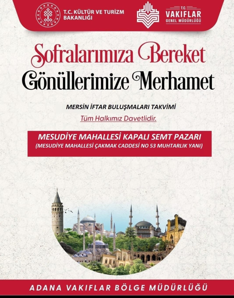 Vakıflar Genel Müdürlüğü, Ramazan boyunca Türkiye genelinde düzenlediği iftar sofralarıyla, asırlık dayanışma geleneğini yaşatmaya devam ediyor. Adana’nın Yüreğir Halk Eğitim Merkezi Düğün Salonu ve Çukurova Üniversitesi Yemekhanesi’nde, Osmaniye’de Millet Bahçesi’nde ve Mersin’de Mesudiye Mahallesi Kapalı Semt Pazarı’nda kurulacak iftar sofraları, vatandaşları aynı masada buluşturacak.