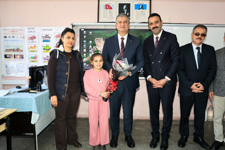 Vali Mustafa Yavuz, Karaisalı’daki ziyaretleri kapsamında daha önce söz verdiği üzere Şehit Mehmet Çalışkan İlkokulu’nda öğrenim gören 4. sınıf öğrencisi Ayşe Şura Bozkurt’a sürpriz bir ziyaret gerçekleştirdi. Sınıftaki diğer öğrencilerimizle de bir araya gelen Vali Mustafa Yavuz, öğrenci ile sohbet etti.
