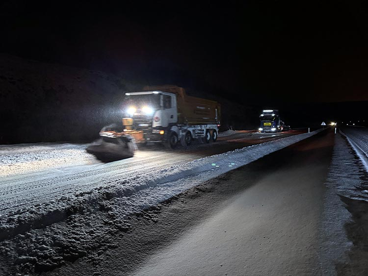 Karayolları 183. Şube Şefliğine bağlı ekipler, yolda tuzlama çalışması yaparken, ağır tonajlı araçlar Damal ilçesindeki İl Özel İdaresine ait tır parkında bekliyor.