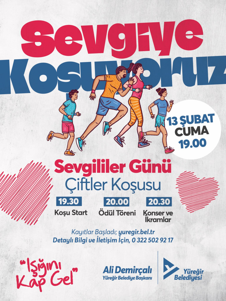 Yüreğir Belediyesi, Sevgililer Günü’nde çiftleri “Sevgiye Koşuyoruz” etkinliğinde buluşturuyor. 13 Şubat’ta düzenlenecek 2K Çiftler Koşusu’nda spor ve müzik bir arada olacak.