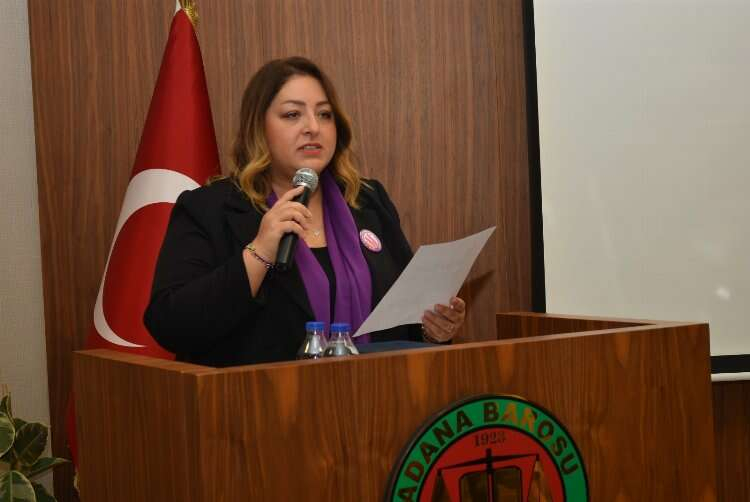 Adana Barosu adına konuşma gerçekleştiren Kadın Hakları Merkezi Başkanı Av. Açelya Can Güneş, “167 yıl önce bugün New Yokta tekstil fabrikasında çalışan kadın işçiler ağır çalışma şartlarını protesto etmek ve eşit işe eşit ücret gibi insanca yaşama ve çalışma koşullarına sahip olabilmek adına bir eşitlik mücadelesi başlattılar. 129 dokuma işçisi kadın bu insanca yaşam hakkı ve eşitlik taleplerinin bedelini, atölyelerinde çıkarılan yangında kilitli kapılar ardında can vererek ödediler” dedi.