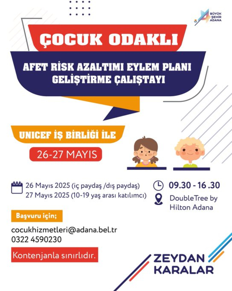 Adana’da çocukların afetlere karşı korunması ve güçlendirilmesi için önemli bir adım atılıyor. Adana Büyükşehir Belediyesi ile UNICEF Türkiye iş birliğiyle 26-27 Mayıs tarihlerinde “Çocuk Odaklı Afet Risk Azaltımı Eylem Planı Geliştirme Çalıştayı” düzenlenecek.