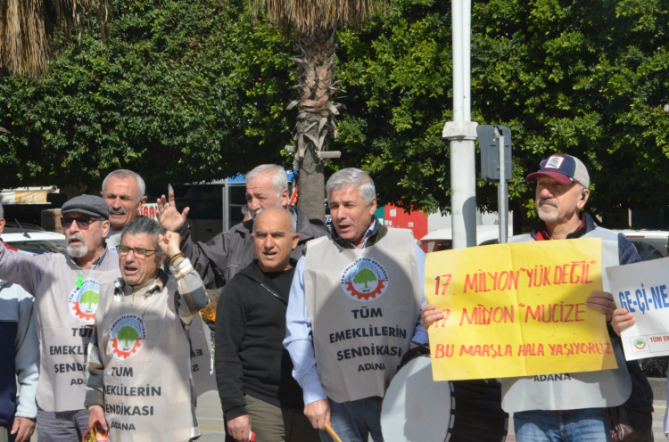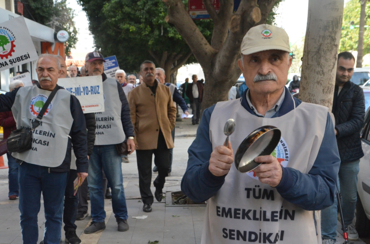 Adana’da emekliler, maaşlarının yetersizliğine dikkat çekmek için davul çalıp mâni söyleyerek yürüyüş düzenledi. Tüm Emeklilerin Sendikası Adana Şubesi tarafından yapılan etkinlikte emekliler Sular Kavşağında emekliler bir araya gelerek ellerinde davul, düdük ve tavalarla İnönü Parkına kadar yürüdü. Emekliler yürüyüş boyunca maniler söyleyen emekliler, mevcut maaşlarla geçinemediklerini dile getirerek zam taleplerini yineledi.