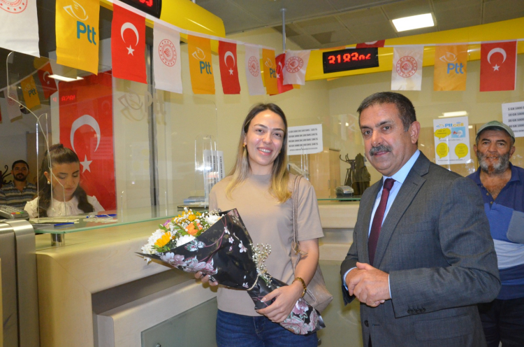 Adana’nın Seyhan İlçesi’nde bulunan Cemalpaşa PTT Müdürlüğü, PTT’nin 185. kuruluş yıl dönümünü etkinlikle kutladı. Kurum, yıl dönümü kapsamında 185. müşteriye çeşitli hediyeler takdim etmeyi kararlaştırdı. PTT Adana Başmüdürü Korkmaz Gencer ve PTT Müdürleri, 185. müşteriyi karşılamak için şubeye geldi. 185. sıradaki fişi Seda Başdoğan aldı. Vezneye gelen Başdoğan, işlemlerini başlatırken Gencer, elinde çiçekle müşteriye sürpriz yaptı. Gencer ve PTT müdürleri, günün anısına Başdoğan’a çeşitli hediyeler verdi.