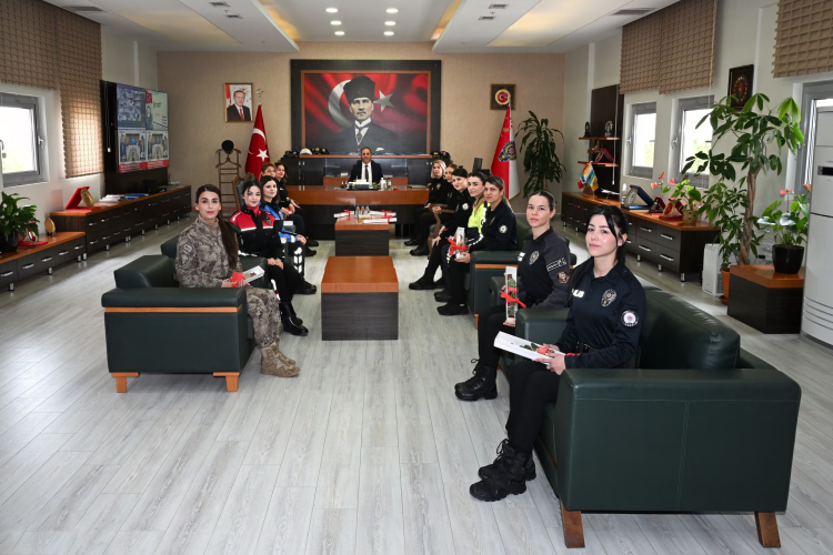 Adana İl Emniyet Müdürü Ahmet Hakan Arıkan, 8 Mart Dünya Kadınlar Günü dolayısıyla makamında ağırladığı kadın polislere gül verdi.