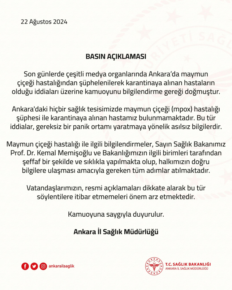 Ankara İl Sağlık Müdürlüğü, bu iddialara ilişkin hızlı bir yanıt verdi. Müdürlüğün sosyal medya hesabından yapılan açıklamada, “Ankara’daki hiçbir sağlık tesisimizde Maymun çiçeği (mpox) hastalığı şüphesi ile karantinaya alınan hastamız bulunmamaktadır. Bu tür iddialar, gereksiz bir panik ortamı yaratmaya yönelik asılsız bilgilerdir” denildi. Ayrıca, Sağlık Bakanı Kemal Memişoğlu’nun daha önce yaptığı açıklamada, ülkemizde Maymun çiçeği vakası bulunmadığını ve testlerin negatif sonuçlandığını belirttiği vurgulandı.