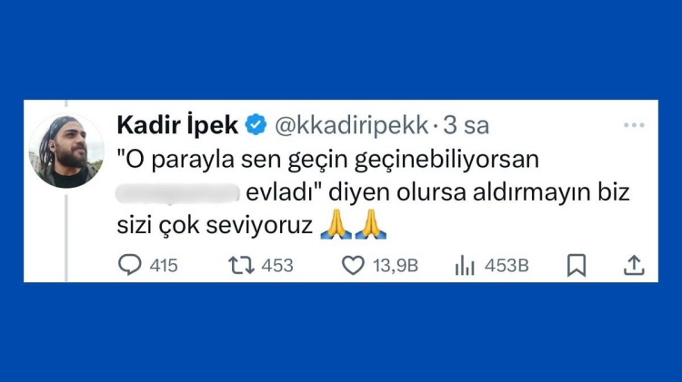 Kadir İpek, geçtiğimiz yıllarda da sosyal medyada Rusya Devlet Başkanı Vladimir Putin’e yönelik küfürlü ifadeler kullandığı gerekçesiyle gözaltına alınmış, daha sonra yurt dışı yasağı ile serbest bırakılmıştı. Şimdi ise, Cumhurbaşkanı Erdoğan’a yönelik yazdığı mesaj nedeniyle tekrar gündeme geldi.