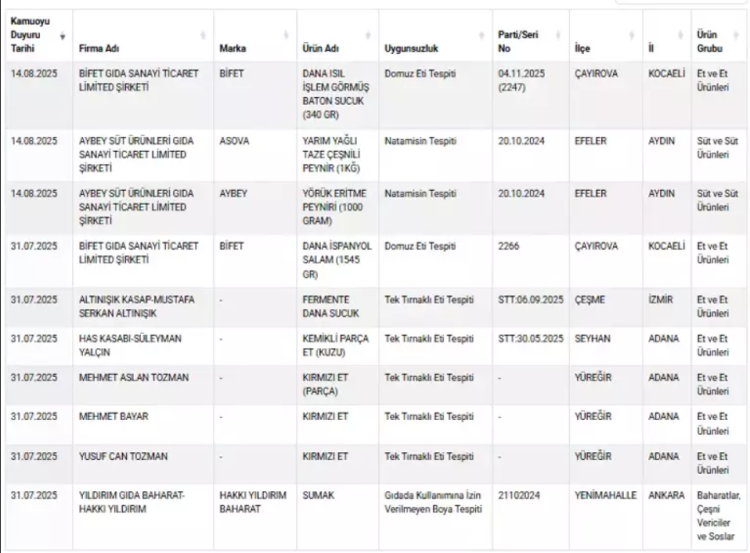 Tarım ve Orman Bakanlığı, halk sağlığını tehlikeye atan gıda firmalarına yönelik denetimlerini sürdürdü. Bakanlık tarafından yayımlanan yeni listede, daha önce salamında domuz eti tespit edilen Bifet markalı sucuklar bir kez daha yer aldı.