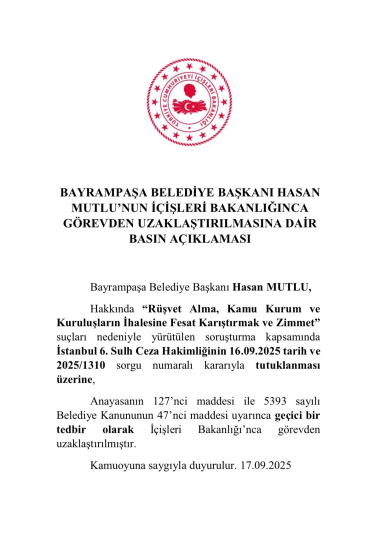 Özetle: Bayrampaşa Belediye Başkanı Hasan Mutlu, yolsuzluk soruşturması kapsamında tutuklanarak görevden uzaklaştırıldı. Soruşturma çerçevesinde toplam 20 kişi tutuklanmış, 16 kişi adli kontrol altına alınmış durumda.