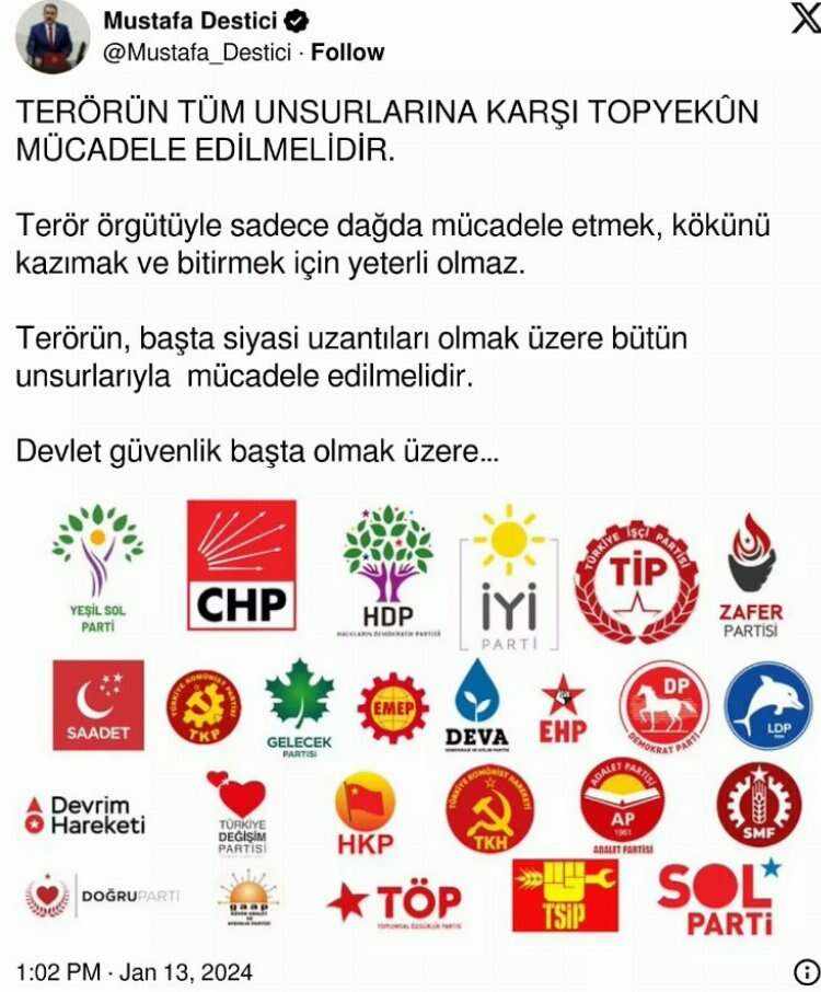 Sosyalist Parti, Cumhuriyet Halk Partisi (CHP), Demokrat Parti, Türkiye İşçi Partisi (TİP), İYİ Parti gibi partilerin logolarının bulunduğu bir görseli paylaşan Destici, bu partileri 'terör örgütü' desteklemekle suçladı ve bu durumla mücadele edilmesi gerektiğini belirtti.