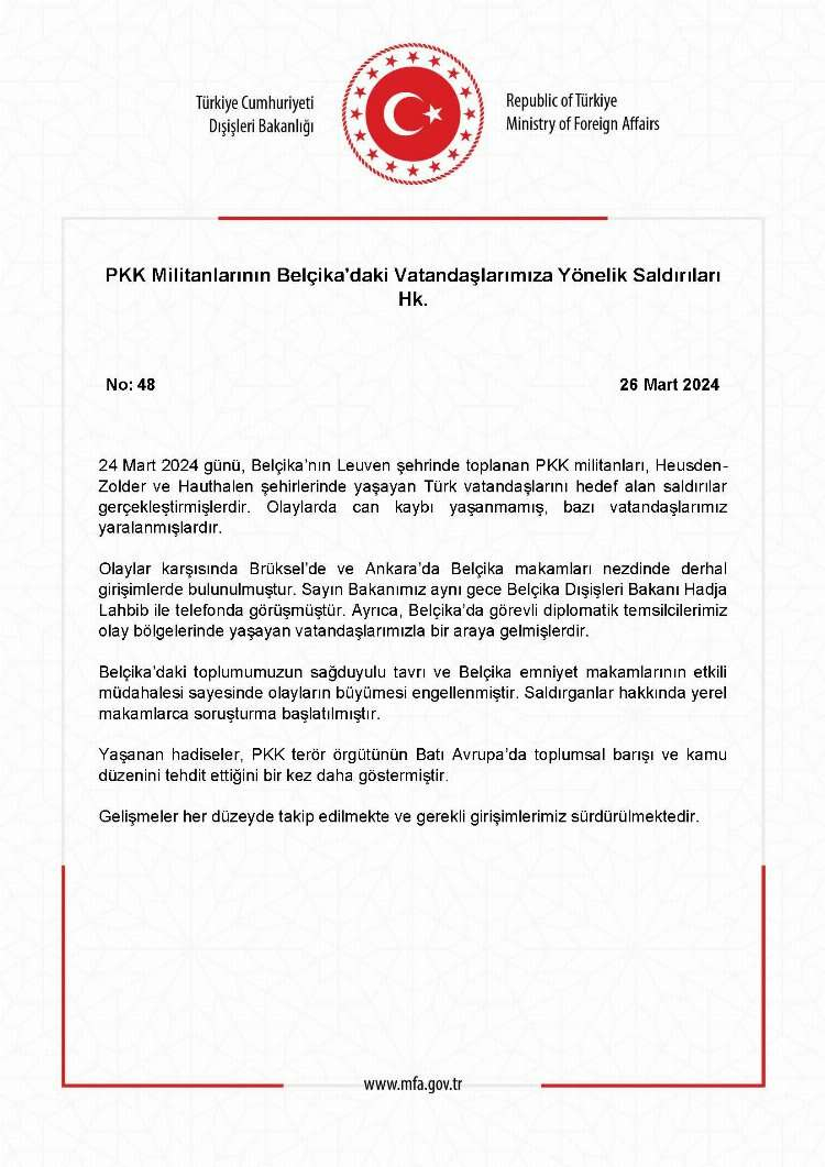 Belçika'daki Türk Vatandaşlarına Yönelik PKK Saldırısıyla İlgili Dışişleri Bakanlığı Açıklaması