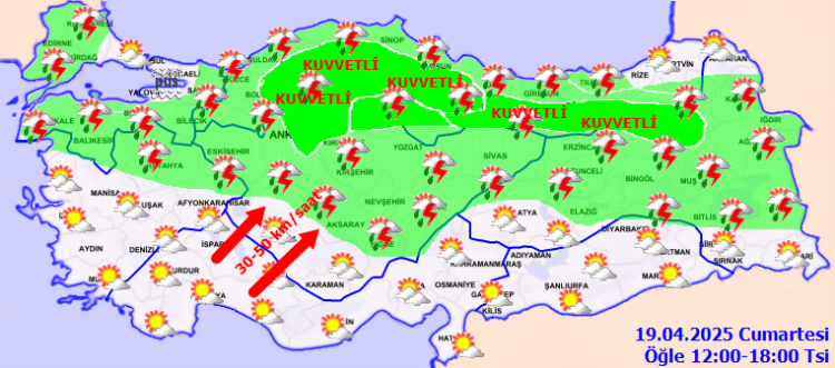 Meteoroloji Genel Müdürlüğü (MGM), 19 Nisan 2025 Cumartesi gününe ilişkin hava durumu tahmin raporunu yayımladı. Yurdun kuzey ve iç kesimleri ağırlıklı olmak üzere birçok bölgede sağanak ve gök gürültülü sağanak yağış beklenirken, bazı iller için yerel kuvvetli yağış uyarısı yapıldı.