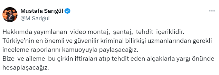 Sarıgül, konuyla ilgili yaptığı paylaşımda şu ifadeleri kullandı: "Hakkımda yayımlanan video montaj, şantaj, tehdit içeriklidir. Türkiye'nin en önemli ve güvenilir kriminal bilirkişi uzmanlarından gerekli inceleme raporlarını kamuoyuyla paylaşacağız. Bize ve aileme bu çirkin iftiraları atan ve tehdit eden alçaklarla yargı önünde hesaplaşacağız."