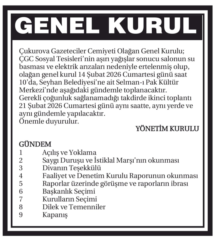 Çukurova Gazeteciler Cemiyeti Olagan Genel Kurulu konu hakkında yaptığı açıklamada, “ÇGC Sosyal Tesisleri'nin aşırı yağışlar sonucu salonun su basması ve elektrik arızaları nedeniyle ertelenmiş olup, olağan genel kurul 14 Şubat 2026 Cumartesi günü saat 10'da, Seyhan Belediyesi'ne ait Selman-1 Pak Kültür Merkezi'nde aşağıdaki gündemle toplanacaktır. Gerekli çoğunluk sağlanamadığı takdirde ikinci toplantı 21 Şubat 2026 Cumartesi günü ayni saatte, ayni yerde ve ayni gündemle yapılacaktır” ifadelerine yer verildi.