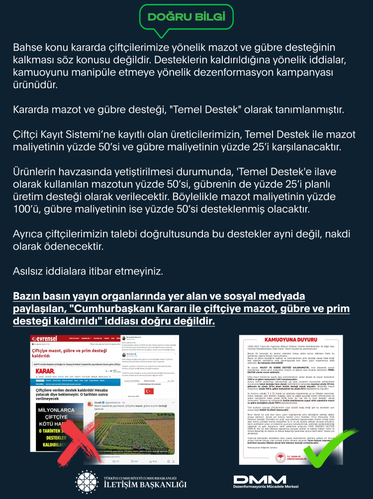 İletişim Başkanlığı Dezenformasyonla Mücadele Merkezi, bazı basın yayın organları ve sosyal medyada dolaşan "Cumhurbaşkanı Kararı ile çiftçilere mazot, gübre ve prim desteği kaldırıldı" iddialarının doğru olmadığını açıkladı. Desteğin devam ettiği ve Temel Destek olarak tanımlandığı belirtildi.