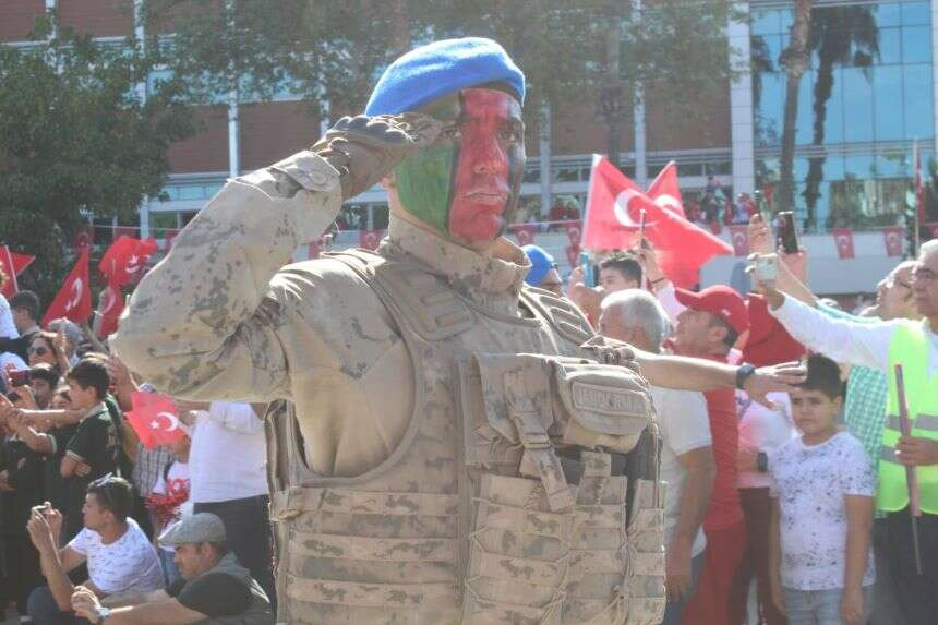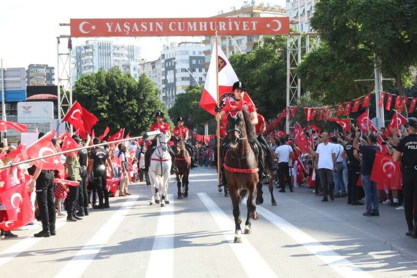 Etkinlikte Adana Valisi Yavuz Selim Köşger, Adana Büyükşehir Belediyesi Başkanı Zeydan Kararlar ve Garnizon Komutanı Tümgeneral Mehmet Özeren askeri cipin üzerinde halkı selamladı. Vali Köşger, asgari cipin üzerinde Adanalıların Cumhuriyet Bayramı’nı kutladı.