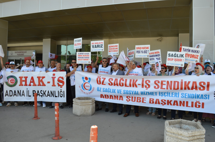 Hak-İş Konfederasyonu’na başlı Öz Sağlık-İş Sendikası Adana Şubesi üyeleri, kamuda çalışan işçilerin ücretlerinin artırılması ve özlük haklarının iyileştirilmesi için Seyhan Devlet Hastanesinde basın açıklaması yaptı. Açıklamayı katılanlar adına açıklamayı Öz Sağlık-İş Sendikası Adana Şube Başkanı Mesut Tekin Demirci okudu. Demirci, yüksek enflasyon ve artan temel ihtiyaç fiyatları karşısında adil bir ücret beklentilerini dile getirerek, “Emeğiyle geçinen insanlar olarak beklentimiz sadece adil bir ücret, insanca yaşam ve ekonomik büyümeden hak ettiğimiz paydır. Kamu çalışanlarının talepleri göz ardı edilmemeli” dedi.