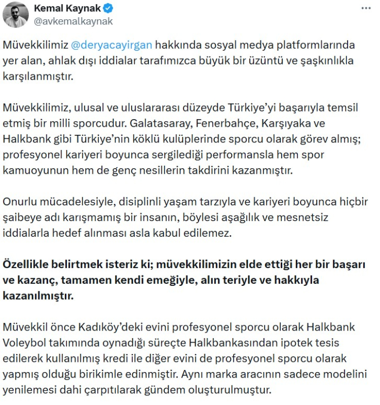Ayrıca avukat Kaynak, bu haberlerin yalnızca Derya Çayırgan’a değil, aynı zamanda spor kamuoyuna ve kadın haklarına karşı yapılmış bir saldırı niteliği taşıdığını belirtti. İddiaların iftira olduğunu vurgulayan Kaynak, ilgililer hakkında suç duyurusunda bulunulduğunu ve manevi tazminat davası açıldığını da duyurdu.