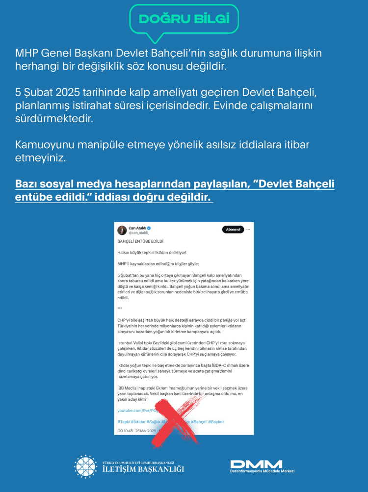 Cumhurbaşkanlığı İletişim Başkanlığı Dezenformasyonla Mücadele Merkezi (DMM), bazı sosyal medya hesaplarından paylaşılan "Devlet Bahçeli entübe edildi" iddiasının doğru olmadığını bildirdi.