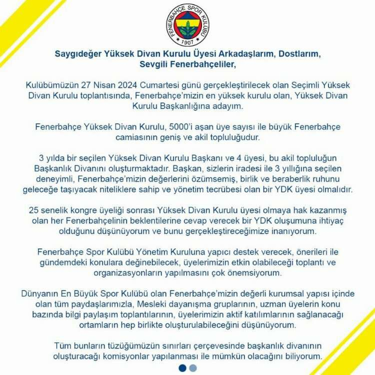 "Kulübümüzün 27 Nisan 2024 Cumartesi günü gerçekleştirilecek olan Seçimli Yüksek Divan Kurulu toplantısında, Fenerbahçe'mizin en yüksek kurulu olan, Yüksek Divan Kurulu Başkanlığına adayım. Fenerbahçe Yüksek Divan Kurulu, 5 bini aşan üye sayısı ile büyük Fenerbahçe camiasının geniş ve akil topluluğudur. 3 yılda bir seçilen Yüksek Divan Kurulu Başkanı ve 4 üyesi, bu akil topluluğun Başkanlık Divanını oluşturmaktadır. Başkan, sizlerin iradesi ile 3 yıllığına seçilen deneyimli, Fenerbahçe'mizin değerlerini özümsemiş, birlik ve beraberlik ruhunu geleceğe taşıyacak niteliklere sahip ve yönetim tecrübesi olan bir YDK üyesi olmalıdır. 25 senelik kongre üyeliği sonrası Yüksek Divan Kurulu üyesi olmaya hak kazanmış olan her Fenerbahçelinin beklentilerine cevap verecek bir YDK oluşumuna ihtiyaç olduğunu düşünüyorum ve bunu gerçekleştireceğimize inanıyorum. Fenerbahçe Spor Kulübü Yönetim Kuruluna yapıcı destek verecek, önerileri ile gündemdeki konulara değinebilecek, üyelerimizin etkin olabileceği toplantı ve organizasyonların yapılmasını çok önemsiyorum. Dünyanın En Büyük Spor Kulübü olan Fenerbahçe'mizin değerli kurumsal yapısı içinde olan tüm paydaşlarımızla, Mesleki dayanışma gruplarının, uzman üyelerin konu bazında bilgi paylaşım toplantılarının, üyelerimizin aktif katılımlarının sağlanacağı ortamların hep birlikte oluşturulabileceğini düşünüyorum. Tüm bunların tüzüğümüzün sınırları çerçevesinde başkanlık divanının oluşturacağı komisyonlar yapılanması ile mümkün olacağını biliyorum.