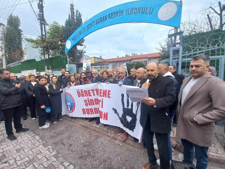 Eğitim İş Adana 1 Nolu Şube Başkanı Hatice Hazar, “İlimizin Seyhan ilçesinde bulunan Şehit Duran Keskin İlkokulu’nda görev yapan öğretmenimiz, bir hafta önce cezaevinden tahliye edilen bir veli tarafından bu okulun önünde, tam da bu alanda, önce darp edilmiş, ardından silahlı saldırıya uğramıştır. Silah ateşlenmiş, öğretmenimizin hayatı açıkça hedef alınmıştır. Son anda gösterdiği refleks sayesinde bir cinayet engellenmiştir. Yani öğretmenimiz bugün tesadüfen, şans eseri hayattadır. Bugün öğretmenimizin başına gelen bu olayın, yarın bizim başımıza gelmeyeceğinin hiçbir garantisi olmadığını biliyoruz. Bu nedenle bugün tepkisiz kalırsak, bu şiddet olayları artarak devam edecek ve biz eğitim emekçileri olarak canımızdan endişe ederek okullara gitmek zorunda kalacağız. Bizler, bu sistemde var olmak istemiyoruz” ifadelerini kullandı.