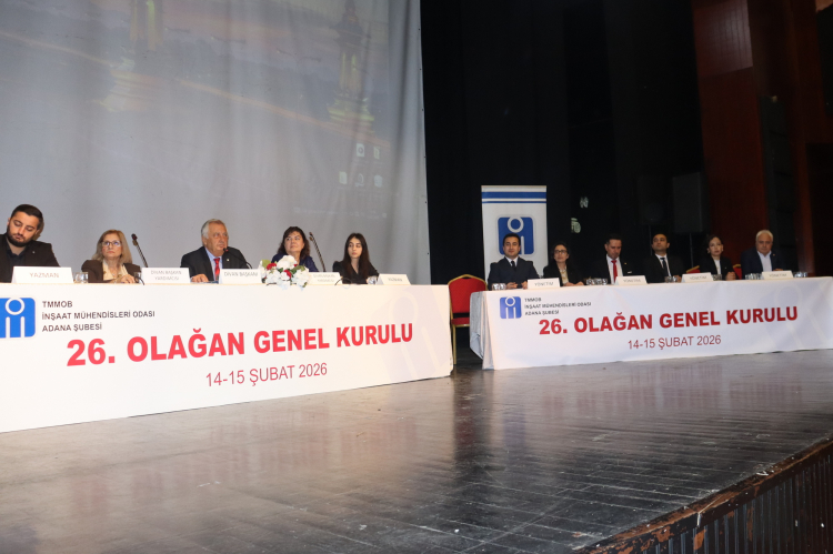 Türk Mühendis ve Mimar Odaları Birliği (TMMOB) İnşaat Mühendisleri Odası (İMO) Adana Şubesi’nin 26. Dönem Genel Kurulu, 14 Şubat Cumartesi günü Yaşar Kemal Kültür Merkezi’nde yapıldı. 15 Şubat Pazar günü ise İMO Adana Şube binasında tek listeyle gerçekleştirilen seçimlerde Çağdaş Demokrat İnşaat Mühendisleri Grubu Yönetim Kurulu seçildi. Genel Kurul, Divan oluşturulmasıyla başladı. Divan Başkanlığına Abdullah Bakır, başkan yardımcılıklarına Emel Varkal ve Eser Çiğdem Coşkun, yazmanlıklara ise Sevgi Yalçın ve Emin Yüksekkaya seçildi. Toplantıya; Adana Büyükşehir Başkan Vekili Güngör Geçer, milletvekilleri Ayhan Barut ve Müzeyyen Şevkin, TMMOB Adana İl Koordinasyon Kurulu Sekreteri Kerem Şahin, siyasi parti temsilcileri ve TMMOB’ye bağlı odaların şube başkanları ile çok sayıda meslek ve emek örgütü temsilcisi katıldı. Toplantının açılış konuşmasını yapan 25. Dönem Şube Başkanı Hıdır Çak, mühendisliğin yalnızca teknik bir meslek değil, doğrudan insan yaşamını ilgilendiren kamusal bir sorumluluk olduğunu vurguladı. Çak, Genel Kurulun geride bırakılan dönemin değerlendirilmesi kadar Adana ve ülke geleceği için mühendislik sorumluluğunu hatırlatma açısından da büyük önem taşıdığını ifade etti.