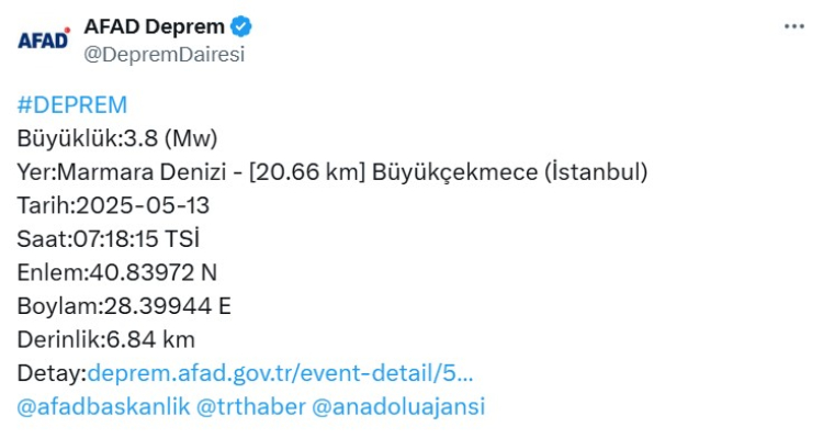 Afet ve Acil Durum Yönetimi Başkanlığı’nın (AFAD) internet sitesinde yer alan bilgiye göre, bugün saat 07:18'de merkez üssü Marmara Denizi olan 3,8 büyüklüğünde bir deprem meydana geldi. Depremin, İstanbul’un Büyükçekmece ilçesine 20,66 kilometre uzaklıkta, yerin 6,84 kilometre derinliğinde gerçekleştiği açıklandı.