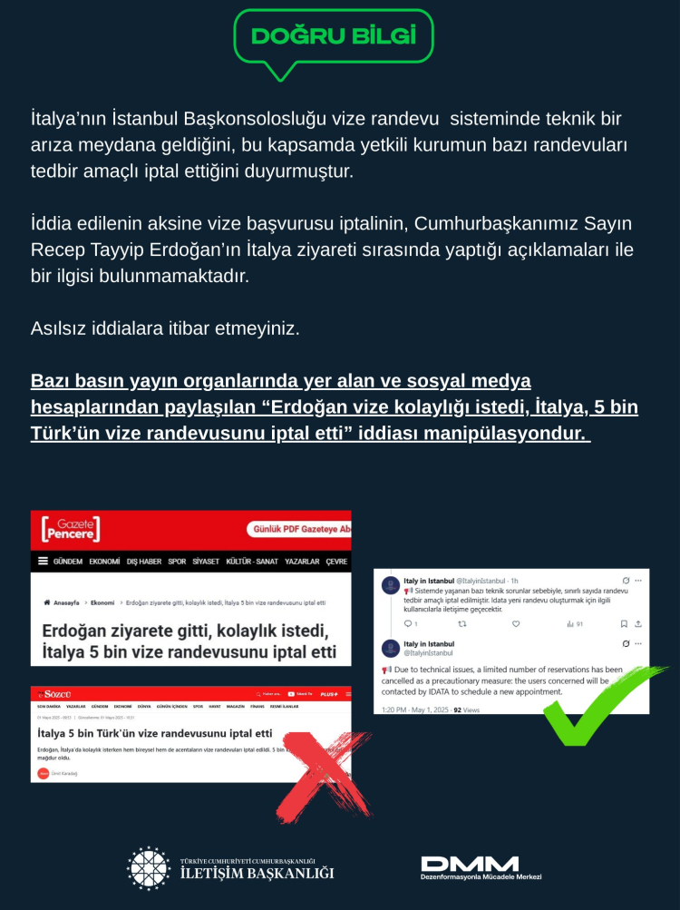İtalya’nın İstanbul Başkonsolosluğu’nun 5 bin Türk vatandaşına ait vize randevusunu iptal etmesi, kamuoyunda büyük yankı uyandırdı. İptal gerekçesi olarak “kategori farkı” öne sürülürken, Dezenformasyonla Mücadele Merkezi (DMM) konuya dair açıklama yaparak “Erdoğan’ın İtalya ziyaretiyle bağlantı” iddialarını kesin bir dille yalanladı.