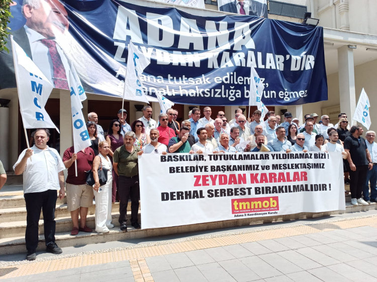 Türk Mühendis ve Mimar Odaları Birliği (TMMOB) Yönetim Kurulu, tutuklu belediye başkanları Zeydan Karalar, Oya Tekin ve Kadir Aydar için Adana Büyükşehir Belediyesi Taş Bina önünde basın açıklaması düzenledi.TMMOB Yönetim Kurulu Başkanı Emin Koramaz tarafından okunan açıklamada, seçilmiş başkanların bir an önce görevlerine iade edilmesi konusunda çağrısında bulunuldu.