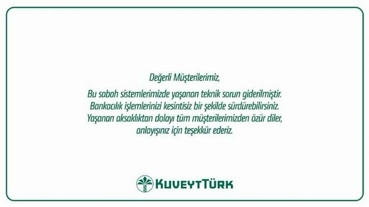 Kuveyt Türk sosyal medya hesabından yapılan açıklamada, “Değerli Müşterilerimiz, Sistemlerimizde yaşanan teknik aksaklık sebebiyle bazı bankacılık işlemlerine erişim kısıtı yaşanmaktadır. Sorunu çözüme kavuşturmak için çalışmalarımız devam etmektedir. Yaşanan aksaklıktan dolayı özür dileriz.”