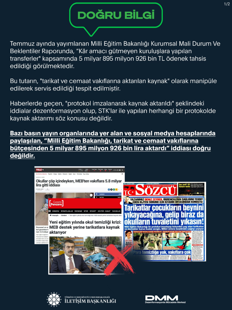 İletişim Başkanlığı, basın yayın organlarında ve sosyal medyada yer alan "Milli Eğitim Bakanlığı'nın (MEB) tarikat ve cemaat vakıflarına 5 milyar 895 milyon 926 bin lira aktardığı" iddiasının doğru olmadığını açıkladı. Bu iddiaların kamuoyunu yanıltma amacı taşıdığı ve manipüle edilerek servis edildiği belirtildi.